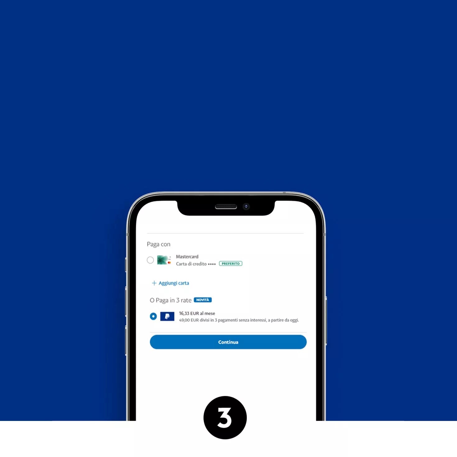 L'opzione <<PayPal Paga in 3 rate>> è disponibile con carta di credito e conto corrente ma non con carta prepagata.